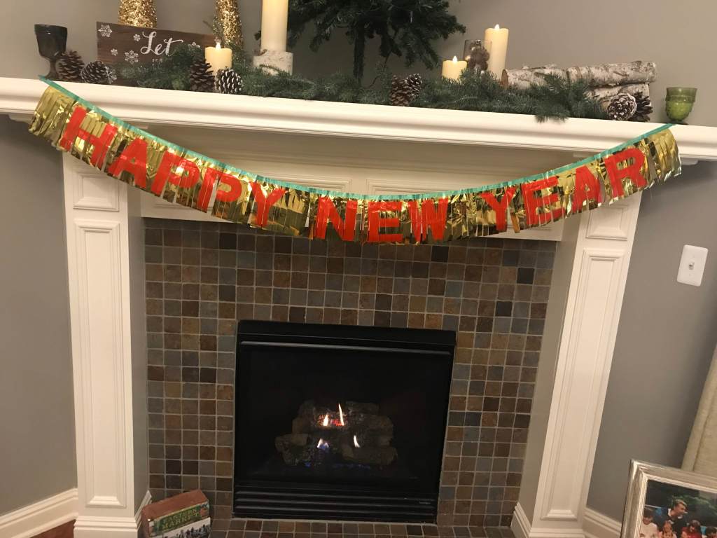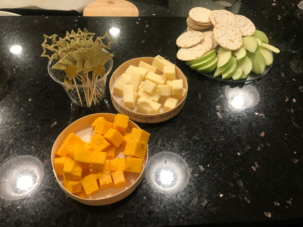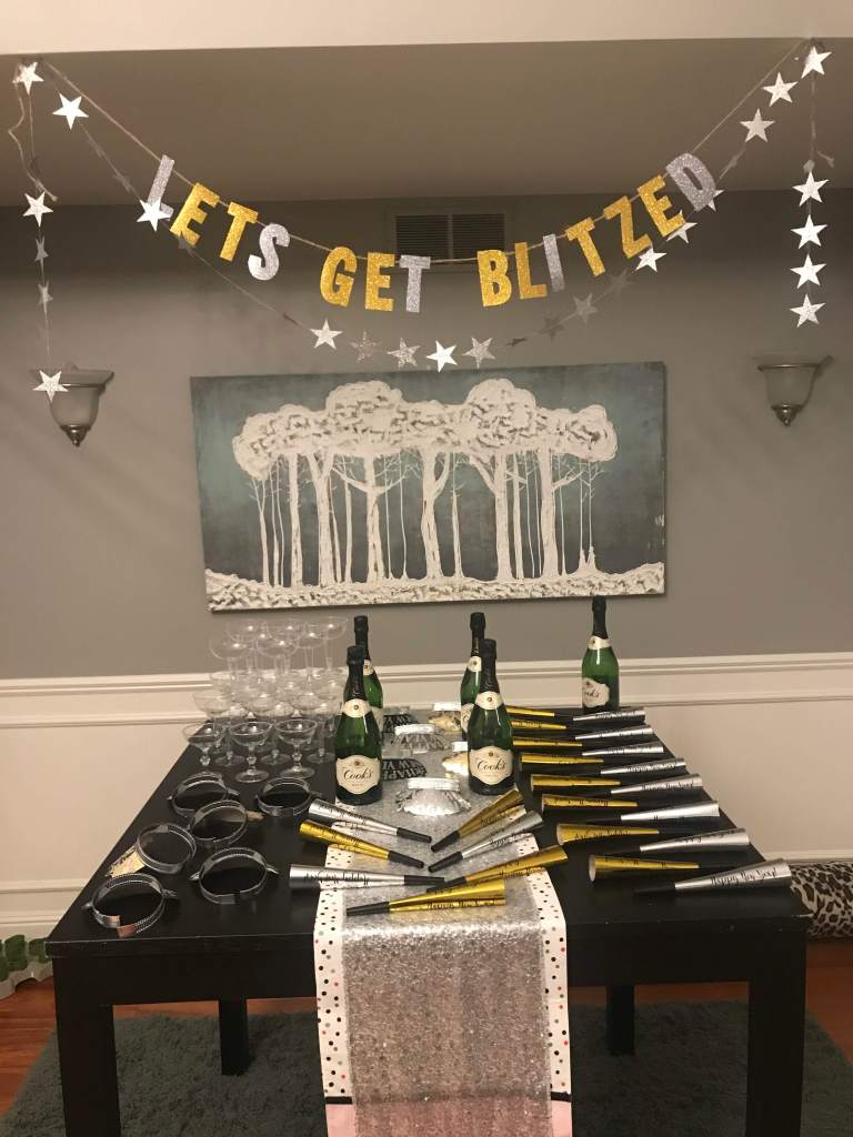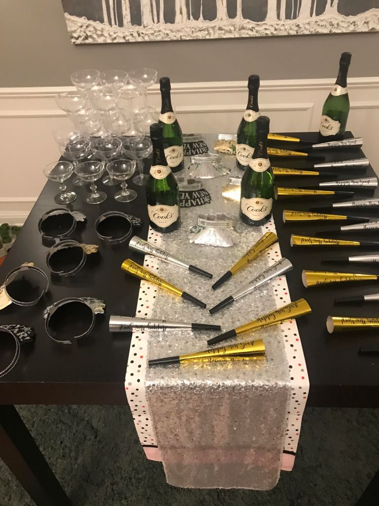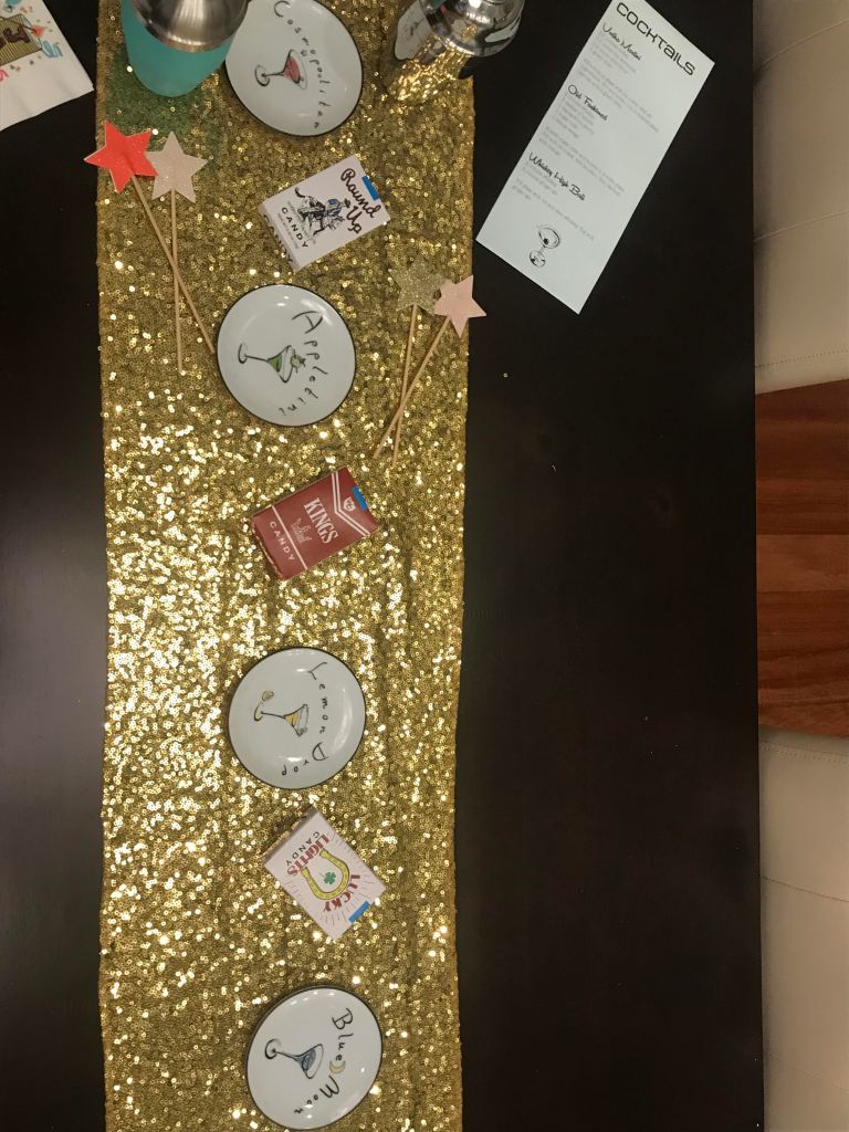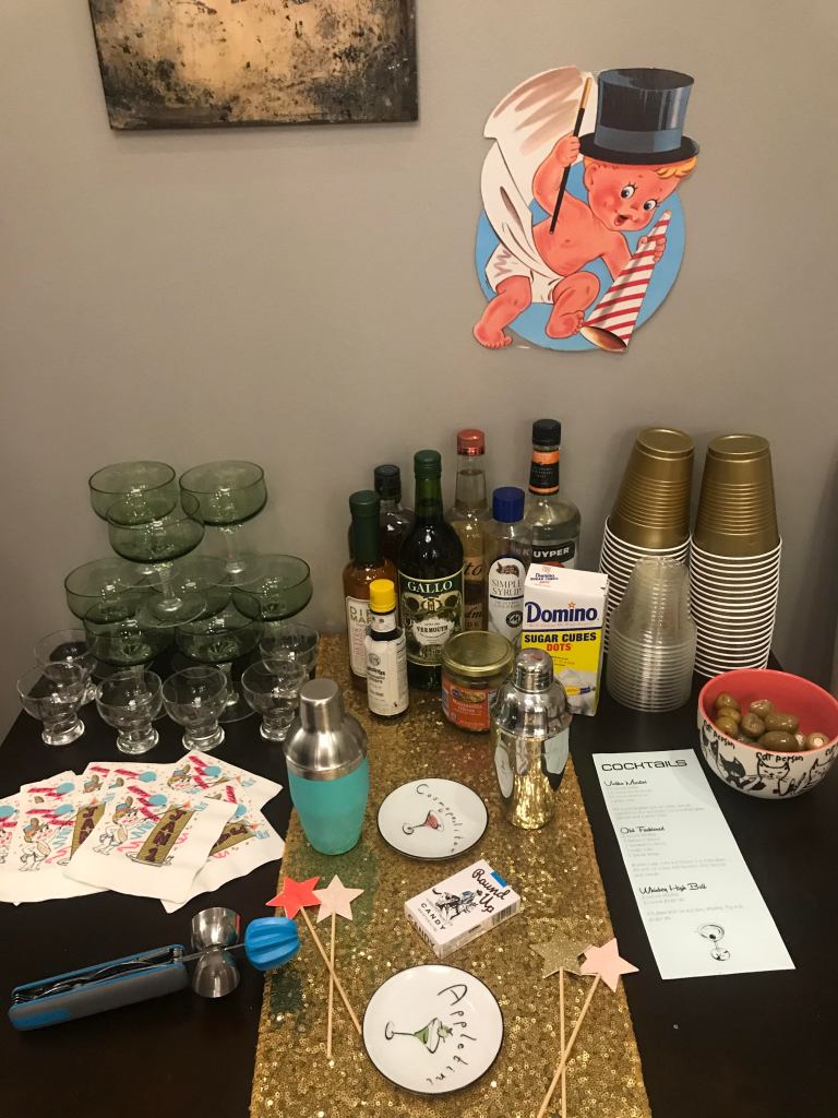 I set up two tables and a counter. One table had all the midnight fixings – noise makers, NYE headbands, champagne and glasses. The other was a cocktail area – a menu with how to make drinks, all the alcohol, shakers, glasses, coasters, etc. Lastly, the counter had all the food!