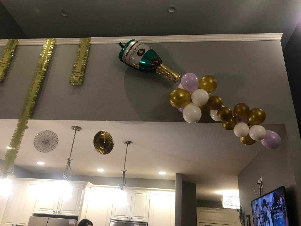 BALLOONS -Champagne pop wall: I tried to make a mini version of this! You can use this balloon strip and place silver, white, gold balloons in each hole. Then tape the champagne bottle balloon to it! –Number balloons are a must-have!