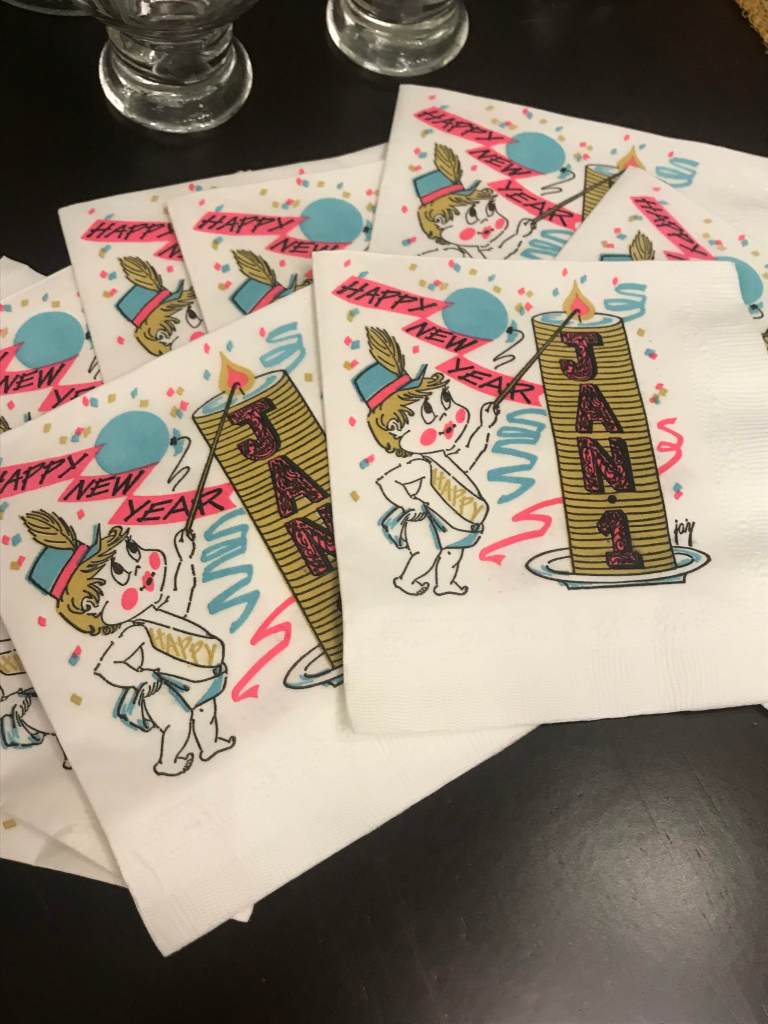 60’S DECOR -I made a sign with glitter letters, “Let’s Get Blitzed” – there are a million other 60’s says you could use! –Fake cigarettes -Vintage New Year’s baby sign –Vintage Happy New Year banner -Vintage napkins -Vintage champagne glasses (from Salvation Army) -Cocktail shakers -Vintage coasters with cocktails on them